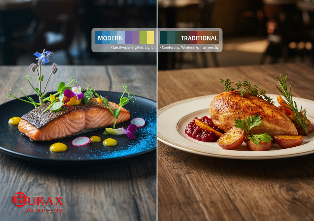 - رنگهای ملایم برای غذاهای سبک و رنگهای گرم برای غذاهای سنگین مناسبترند.